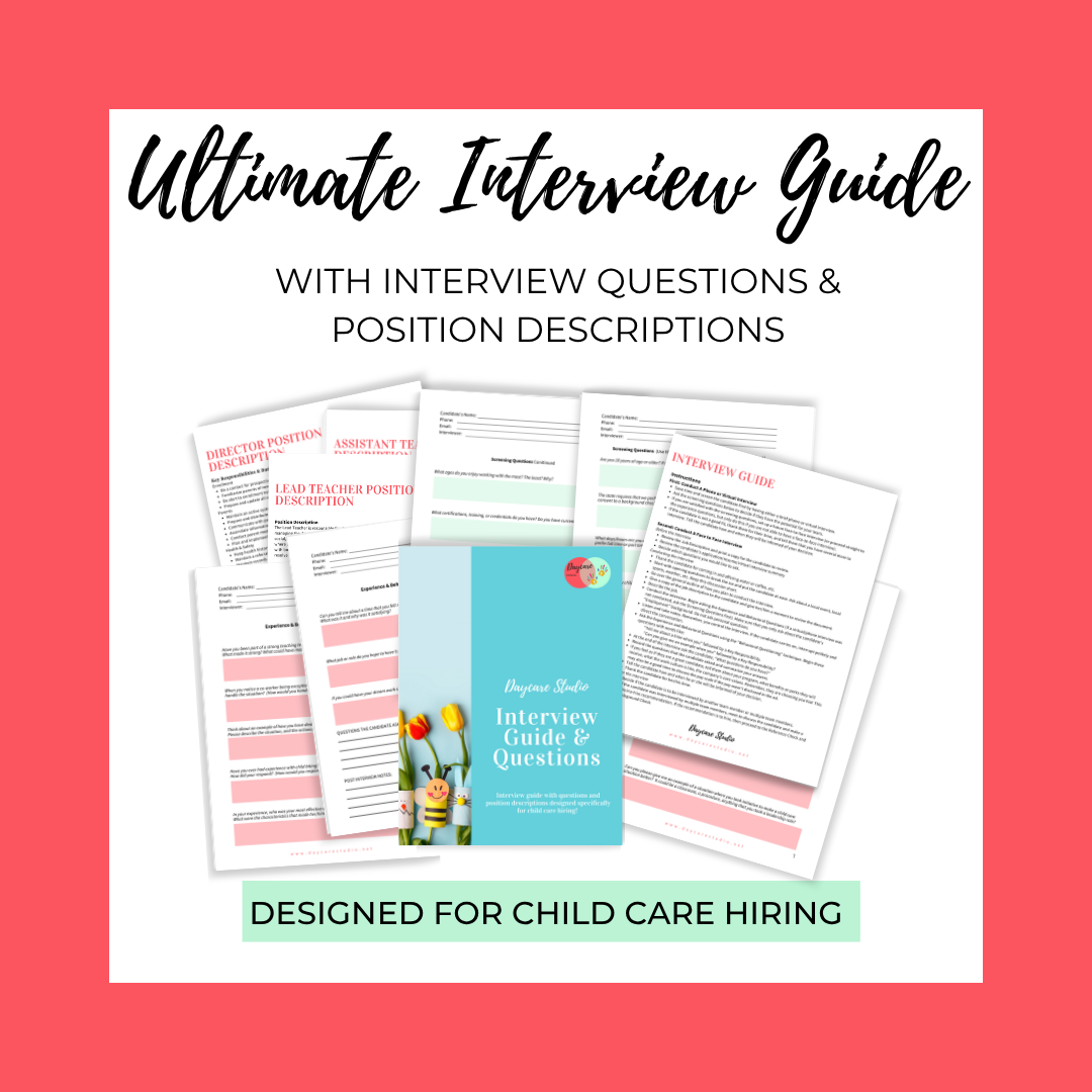 Trouble finding the right teachers? Reduce turnover with my 12-page Interview Guide with Questions and Job Position Descriptions designed for child care hiring! Click the button to get instant access!